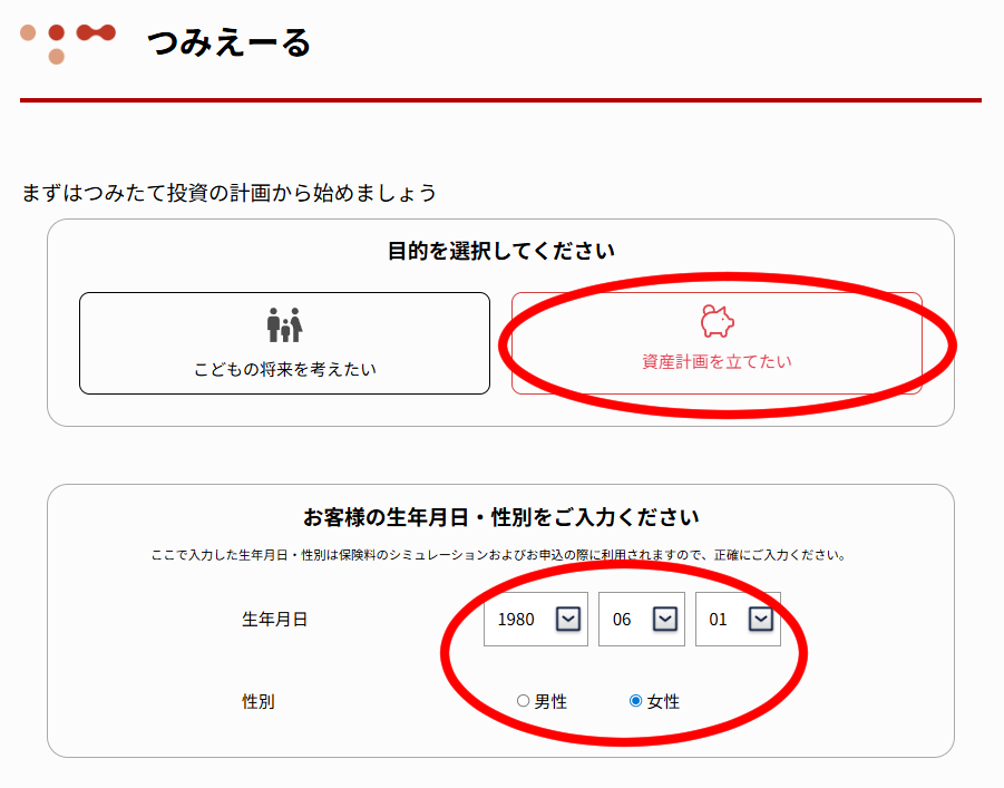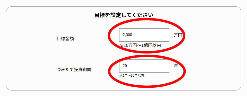 最初にご自身の生年月日や目標金額、つみたて期間を入力します。