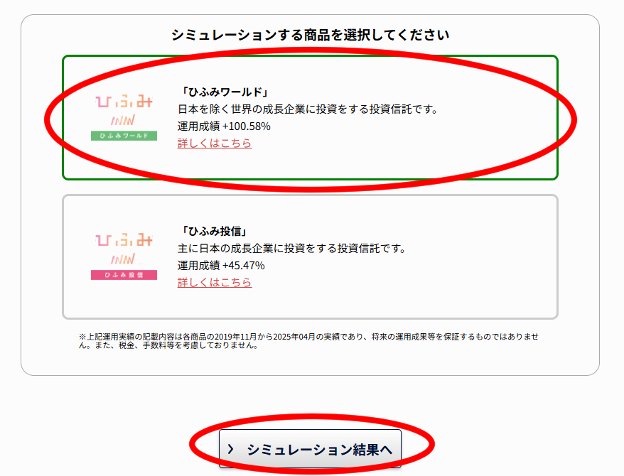 投資信託ひふみシリーズのうち、外国株式に投資する「ひふみワールド」または、主に日本株に投資する「ひふみ投信」をシミュレーションに用います。どちらの投資信託も、これまでの実績から将来の運用成績を見積もり、つみたて投資のリターンが計算されます。