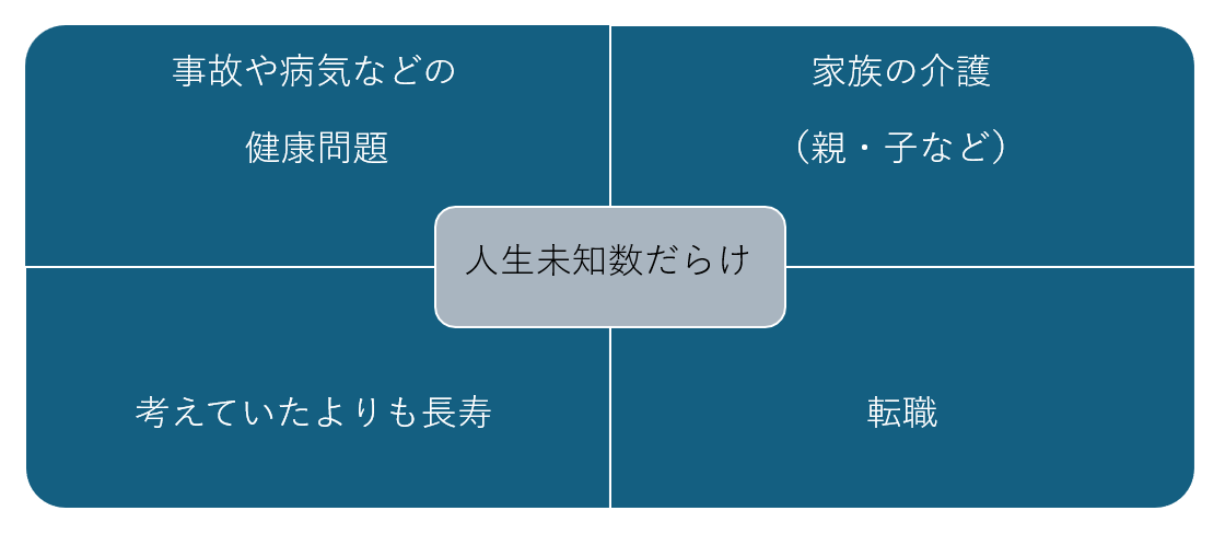 40代から50代にかけては、現役で働きながらも健康問題や家族の介護などが差し迫った問題として顕在化してきます。さらに近年ではこの年代の転職も珍しくなく、生活が大きく変化することも考えられます。