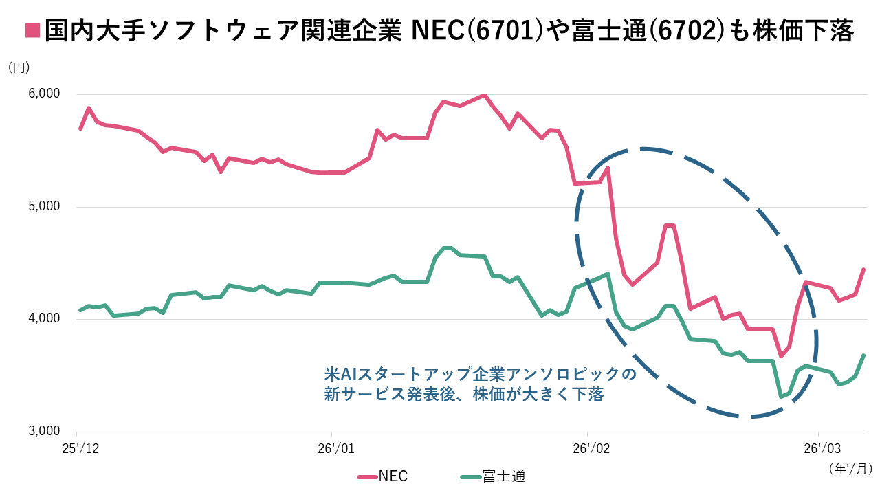 (内藤):ひふみ投信マザーファンドにおいてもソフトウェア関連企業の投資を行なっています。2026年1月末時点での組み入れ銘柄の中であれば、NEC(6701)や富士通(6702)などがあります。これらの企業の株価も2026年2月に大きく下落しました。