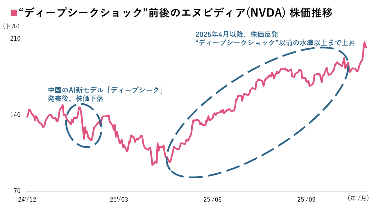 しかし、下落がいつまでも続いたわけではありません。例えば、米ハイテク企業の代表ともいえるエヌビディア(NVDA)の株価を見てみると、一時的な調整があったものの2025年4月ごろからは株価上昇に転じています。