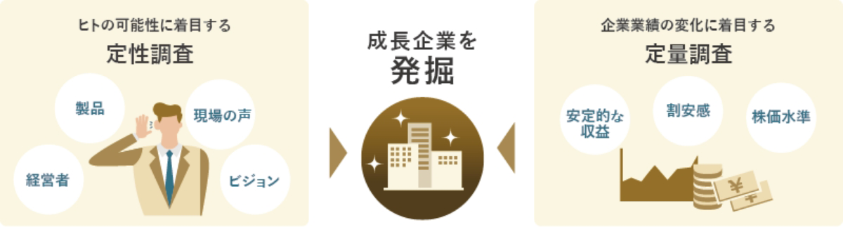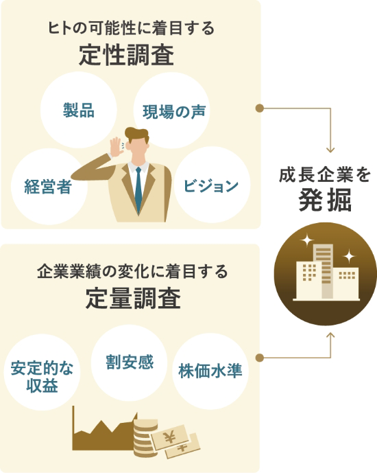 未上場企業、上場企業ともに投資する銘柄をみつけるために、定量(企業業績の変化、株価水準、割安性など)と定性(経営の質、競争力、現場の活気など)の両面から、徹底的な調査・分析を行なっています。